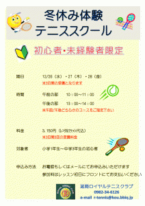 ★12/26(水)~28(金)までの3日間限定!!★ 初心者体験ジュニアスクールです まずはお気軽にお問い合わせください(*^_^*) PDFファイルのダウンロードはこちらからどうぞ冬休み体験スクール案内