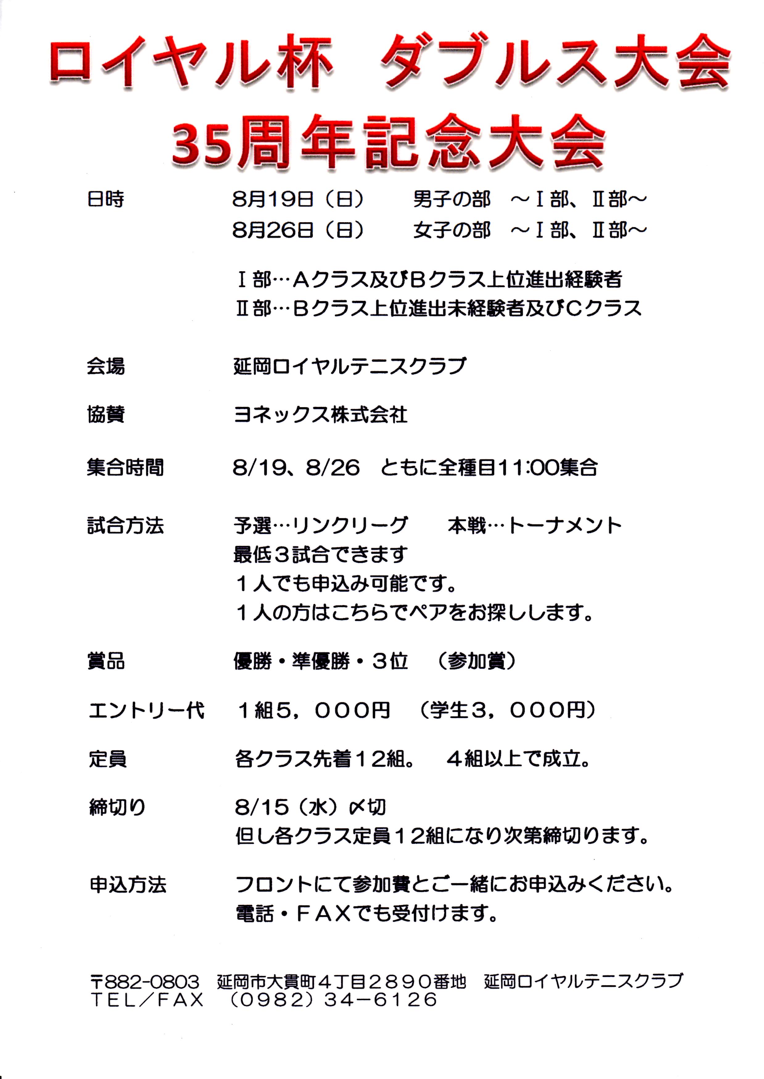 ロイヤル杯 開催 2018年7月19日 最終更新日時 : 2018年7月19日 royaltennis この度、35周年記念大会のロイヤル杯を開催することとなりました。 たくさんの方のご参加お待ちしております。 FacebookXBluesky